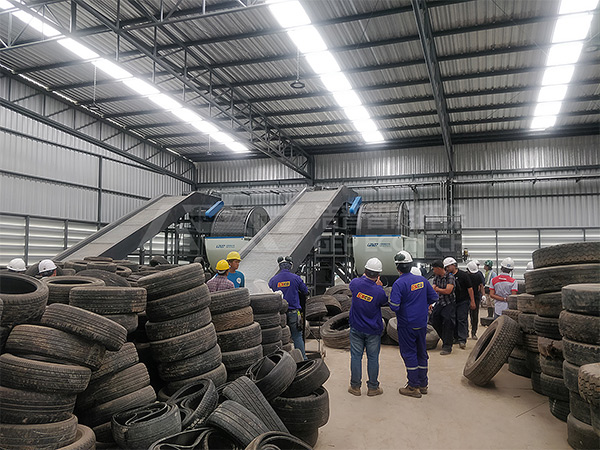 廢舊輪胎處理設備的廢舊輪胎膠粉設備配置由輪胎雙鉤拉絲機,大型輪胎撕碎機,輪胎破膠機,水冷降溫系統,輪胎回轉篩分機設備,輪胎膠粉自動打包機。