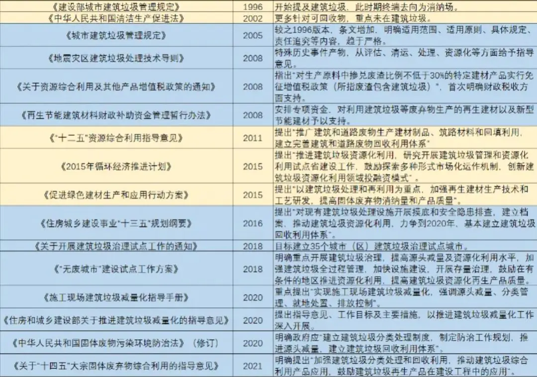 建筑垃圾資源化處理領(lǐng)域之所以被認(rèn)為是“新藍(lán)海”,不但因?yàn)榻ㄖ拇媪俊⒃鲩L和來源上具備巨大的長效發(fā)展?jié)摿Γ蚱渫耆闲沦|(zhì)生產(chǎn)力和綠色生產(chǎn)力的特性,與國家“十四五規(guī)劃”和“雙碳”目標(biāo)高度一致,受到了來自頂層設(shè)計(jì)端的大力支持。