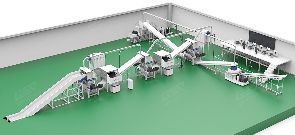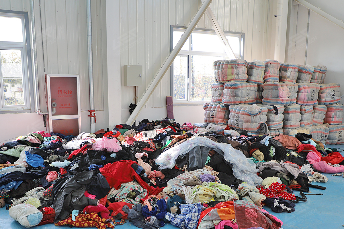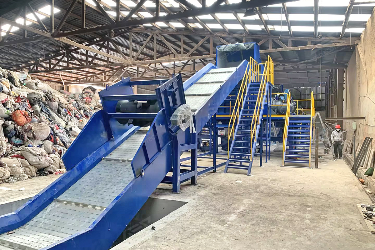 針對(duì)廢紡纖維纏繞性強(qiáng)、成分復(fù)雜的特點(diǎn),潔普創(chuàng)造性采用 "鏈板進(jìn)料+三級(jí)雙軸撕碎+皮帶輸送+磁選除鐵+液壓打包" 工藝:
