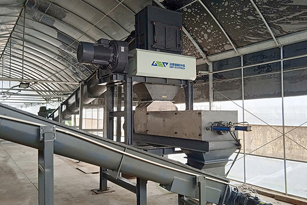 3、分類后的餐廚垃圾通過螺旋輸送至雙軸剪切式破碎機(廚余垃圾破碎機),破碎餐廚垃圾中的有機物和塑料袋;